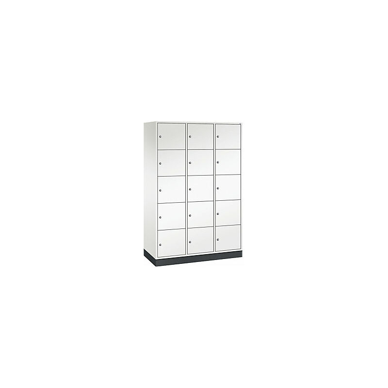 Armadietto a scomparti in acciaio INTRO, altezza scomparto 345 mm, largh. x prof. 1220 x 500 mm, 15 scomparti, corpo bianco puro, ante bianco puro. Fornitura = montato. Altezza = 1950 mm. Profondità = 500 mm. Larghezza = 1220 mm. Colore corpo = bianco puro RAL 9010. Colore porta = bianco puro RAL 9010. Serratura = serratura a cilindro differenziata. Numero scomparti in larghezza = 3 pz. Numero scomparti = 15 pz. Larghezza scomparti = 300 mm. Materiale = lamiera d'acciaio. Altezza armadietto = 1950 mm. Dotazione interna = senza dotazione interna. Larghezza interna = 360 mm. Altezza interna = 345 mm. Profondità interna = 460 mm. Tipo di porta = anta a battente. Numero chiavi = 2 pz. Altezza scomparti = 345 mm. Larghezza ripiani = 360 mm. Profondità ripiani = 500 mm. Altezza zoccolo = 100 mm. Struttura = con saldatura. Superficie = con verniciatura a forno. Struttura in acciaio di lunga durata. Serratura a cilindro con 2 chiavi. Fori di aerazione sulla parete posteriore e distanziali da