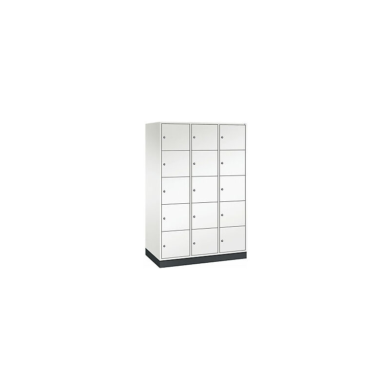 Armadietto a scomparti in acciaio INTRO, altezza scomparto 345 mm, largh. x prof. 1220 x 600 mm, 15 scomparti, corpo bianco puro, ante bianco puro. Fornitura = montato. Altezza = 1950 mm. Profondità = 600 mm. Larghezza = 1220 mm. Colore corpo = bianco puro RAL 9010. Colore porta = bianco puro RAL 9010. Serratura = serratura a cilindro differenziata. Numero scomparti in larghezza = 3 pz. Numero scomparti = 15 pz. Larghezza scomparti = 400 mm. Materiale = lamiera d'acciaio. Altezza armadietto = 1950 mm. Dotazione interna = senza dotazione interna. Larghezza interna = 360 mm. Altezza interna = 345 mm. Profondità interna = 560 mm. Tipo di porta = anta a battente. Numero chiavi = 2 pz. Altezza scomparti = 345 mm. Larghezza ripiani = 400 mm. Profondità ripiani = 600 mm. Altezza zoccolo = 100 mm. Struttura = con saldatura. Superficie = con verniciatura a forno. Struttura in acciaio di lunga durata. Serratura a cilindro con 2 chiavi. Fori di aerazione sulla parete posteriore e distanziali da