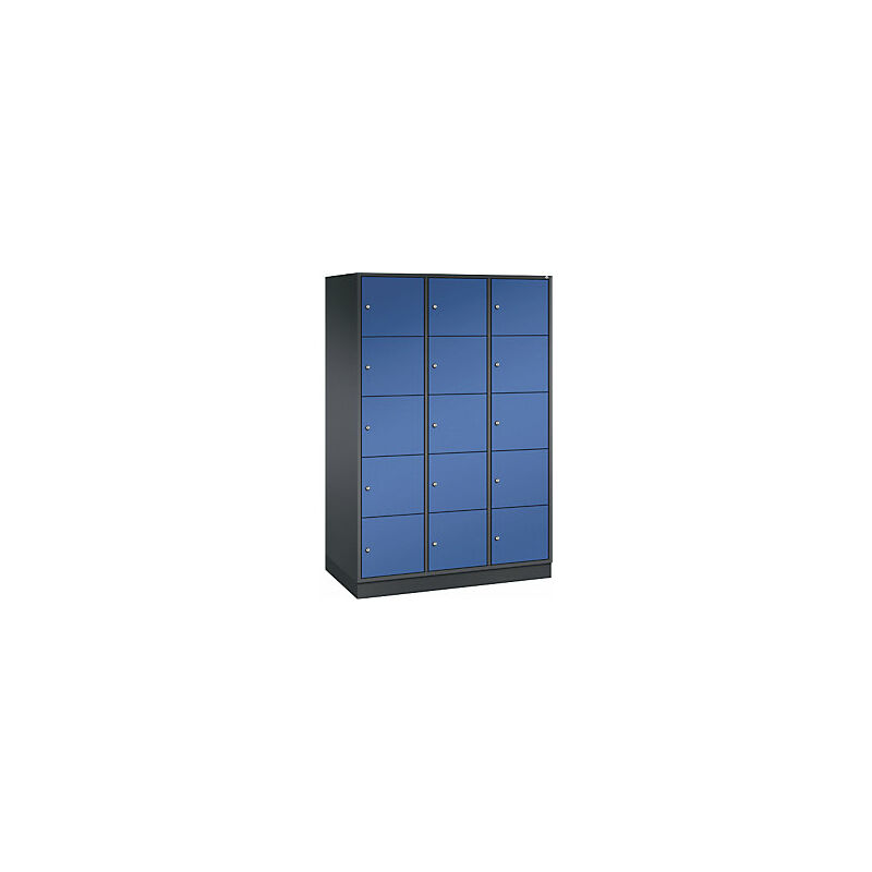 Armadietto a scomparti in acciaio INTRO, altezza scomparto 345 mm, largh. x prof. 1220 x 600 mm, 15 scomparti, corpo grigio nerastro, ante blu genziana. Fornitura = montato. Altezza = 1950 mm. Profondità = 600 mm. Larghezza = 1220 mm. Colore corpo = grigio nerastro RAL 7021. Colore porta = blu genziana RAL 5010. Serratura = serratura a cilindro differenziata. Numero scomparti in larghezza = 3 pz. Numero scomparti = 15 pz. Larghezza scomparti = 400 mm. Materiale = lamiera d'acciaio. Altezza armadietto = 1950 mm. Dotazione interna = senza dotazione interna. Larghezza interna = 360 mm. Altezza interna = 345 mm. Profondità interna = 560 mm. Tipo di porta = anta a battente. Numero chiavi = 2 pz. Altezza scomparti = 345 mm. Larghezza ripiani = 400 mm. Profondità ripiani = 600 mm. Altezza zoccolo = 100 mm. Struttura = con saldatura. Superficie = con verniciatura a forno. Struttura in acciaio di lunga durata. Serratura a cilindro con 2 chiavi. Fori di aerazione sulla parete posteriore e