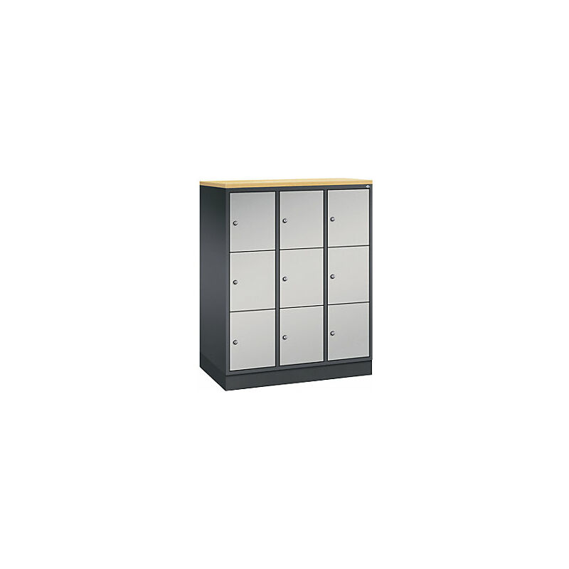 Armadietto a scomparti in acciaio INTRO, altezza scomparto 345 mm, largh. x prof. 920 x 500 mm, 9 scomparti, corpo grigio nerastro, ante alluminio brillante. Fornitura = montato. Altezza = 1250 mm. Profondità = 500 mm. Larghezza = 920 mm. Colore corpo = grigio nerastro RAL 7021. Colore porta = alluminio brillante RAL 9006. Serratura = serratura a cilindro differenziata. Numero scomparti in larghezza = 3 pz. Numero scomparti = 9 pz. Larghezza scomparti = 300 mm. Materiale = lamiera d'acciaio. Altezza armadietto = 1250 mm. Dotazione interna = senza dotazione interna. Larghezza interna = 260 mm. Altezza interna = 345 mm. Profondità interna = 460 mm. Tipo di porta = anta a battente. Numero chiavi = 2 pz. Altezza scomparti = 345 mm. Larghezza ripiani = 300 mm. Profondità ripiani = 500 mm. Altezza zoccolo = 100 mm. Struttura = con saldatura. Superficie = con verniciatura a forno. Struttura in acciaio di lunga durata. Serratura a cilindro con 2 chiavi. Fori di aerazione sulla parete