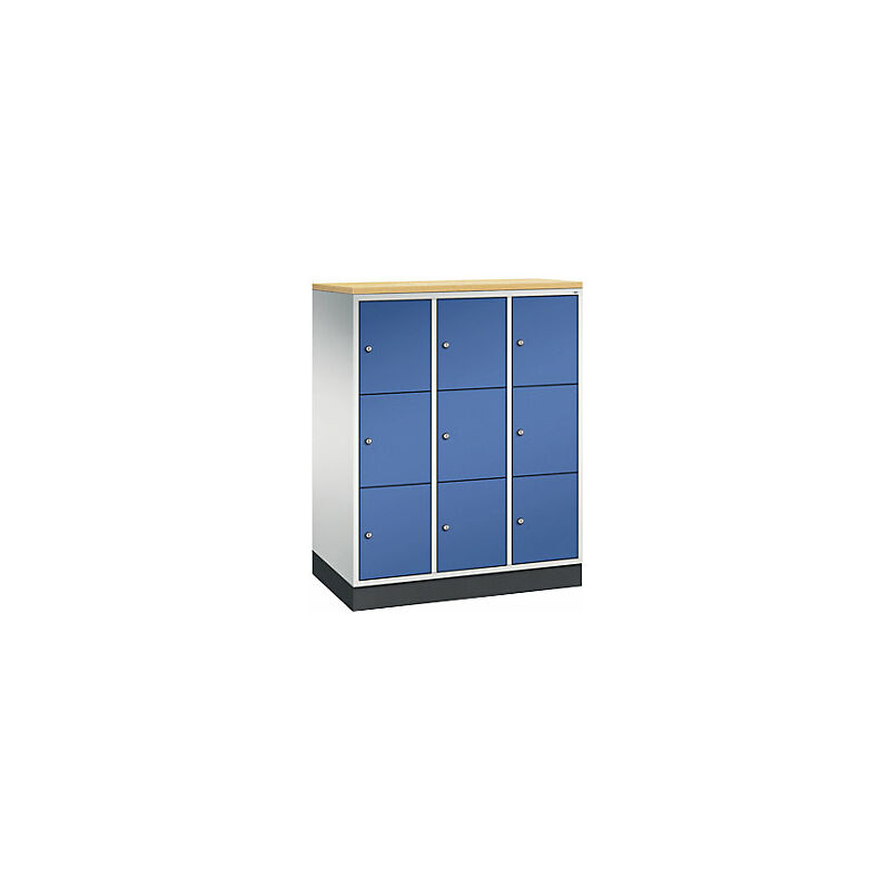 Armadietto a scomparti in acciaio INTRO, altezza scomparto 345 mm, largh. x prof. 920 x 500 mm, 9 scomparti, corpo grigio chiaro, ante blu genziana. Fornitura = montato. Altezza = 1250 mm. Profondità = 500 mm. Larghezza = 920 mm. Colore corpo = grigio chiaro RAL 7035. Colore porta = blu genziana RAL 5010. Serratura = serratura a cilindro differenziata. Numero scomparti in larghezza = 3 pz. Numero scomparti = 9 pz. Larghezza scomparti = 300 mm. Materiale = lamiera d'acciaio. Altezza armadietto = 1250 mm. Dotazione interna = senza dotazione interna. Larghezza interna = 260 mm. Altezza interna = 345 mm. Profondità interna = 460 mm. Tipo di porta = anta a battente. Numero chiavi = 2 pz. Altezza scomparti = 345 mm. Larghezza ripiani = 300 mm. Profondità ripiani = 500 mm. Altezza zoccolo = 100 mm. Struttura = con saldatura. Superficie = con verniciatura a forno. Struttura in acciaio di lunga durata. Serratura a cilindro con 2 chiavi. Fori di aerazione sulla parete posteriore e distanziali da