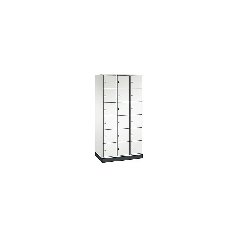Armadietto a scomparti in acciaio INTRO, altezza scomparto 285 mm, largh. x prof. 920 x 500 mm, 18 scomparti, corpo bianco puro, ante bianco puro. Fornitura = montato. Altezza = 1950 mm. Profondità = 500 mm. Larghezza = 920 mm. Colore corpo = bianco puro RAL 9010. Colore porta = bianco puro RAL 9010. Serratura = serratura a cilindro differenziata. Numero scomparti in larghezza = 3 pz. Numero scomparti = 18 pz. Larghezza scomparti = 300 mm. Materiale = lamiera d'acciaio. Altezza armadietto = 1950 mm. Dotazione interna = senza dotazione interna. Larghezza interna = 260 mm. Altezza interna = 285 mm. Profondità interna = 460 mm. Tipo di porta = anta a battente. Numero chiavi = 2 pz. Altezza scomparti = 285 mm. Larghezza ripiani = 300 mm. Profondità ripiani = 500 mm. Altezza zoccolo = 100 mm. Struttura = con saldatura. Superficie = verniciatura. Struttura in acciaio di lunga durata. Serratura a cilindro con 2 chiavi. Fori di aerazione sulla parete posteriore e distanziali da 20 mm. Angolo