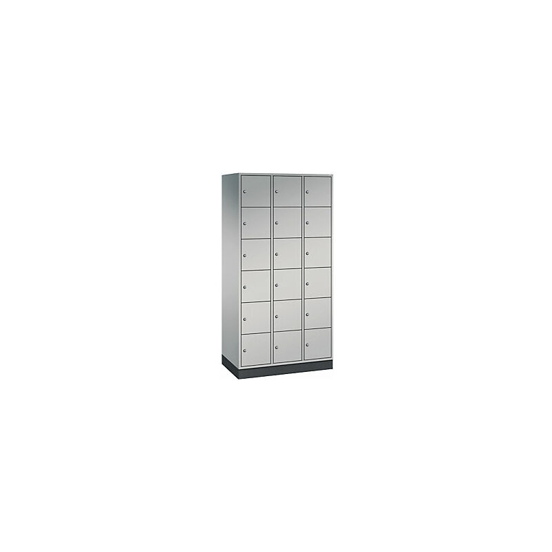 Armadietto a scomparti in acciaio INTRO, altezza scomparto 285 mm, largh. x prof. 920 x 500 mm, 18 scomparti, corpo alluminio brillante, ante alluminio brillante. Fornitura = montato. Altezza = 1950 mm. Profondità = 500 mm. Larghezza = 920 mm. Colore corpo = alluminio brillante RAL 9006. Colore porta = alluminio brillante RAL 9006. Serratura = serratura a cilindro differenziata. Numero scomparti in larghezza = 3 pz. Numero scomparti = 18 pz. Larghezza scomparti = 300 mm. Materiale = lamiera d'acciaio. Altezza armadietto = 1950 mm. Dotazione interna = senza dotazione interna. Larghezza interna = 260 mm. Altezza interna = 285 mm. Profondità interna = 460 mm. Tipo di porta = anta a battente. Numero chiavi = 2 pz. Altezza scomparti = 285 mm. Larghezza ripiani = 300 mm. Profondità ripiani = 500 mm. Altezza zoccolo = 100 mm. Struttura = con saldatura. Superficie = verniciatura. Struttura in acciaio di lunga durata. Serratura a cilindro con 2 chiavi. Fori di aerazione sulla parete posteriore