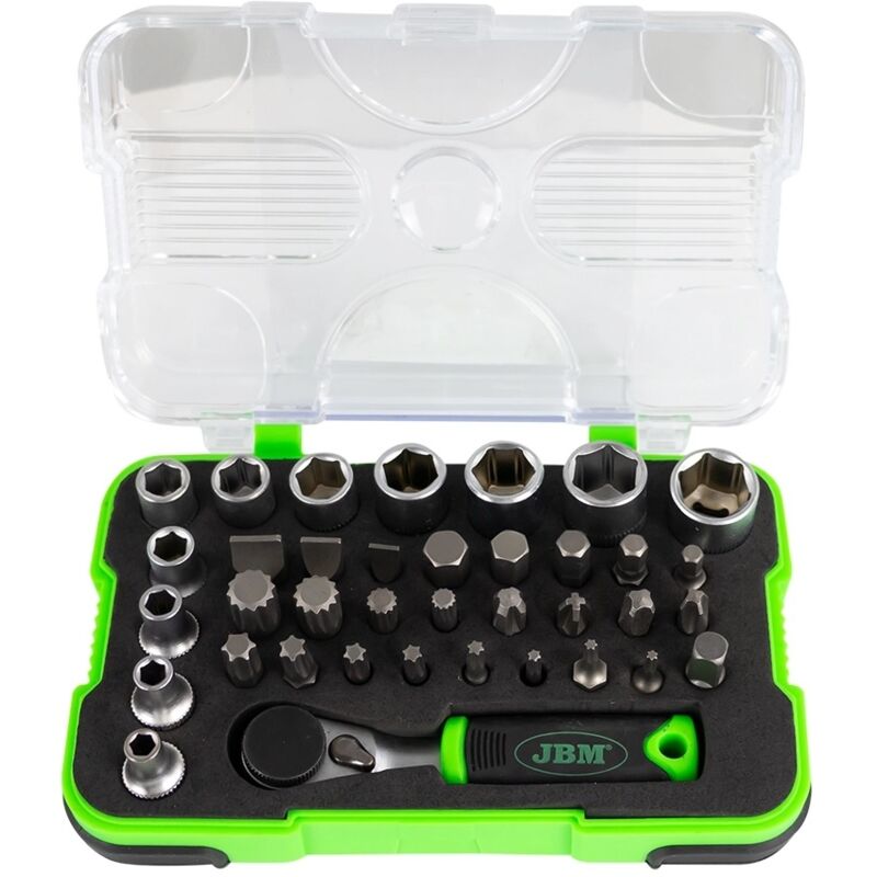 VALIGIA UTENSILI CONTENENTE: - Cricchetto da 80 mm 1/4 "72 denti - Bussole: 13, 12, 11, 10, 9, 8, 7, 6, 5, 4,5 e 4 mm - Punta piatta: 10 mm, 8 mm e 6 mm - Punta Torx: T40-T30-T25-T20-T15-T10-T9-T8 - Punta a 12 punte: 10mm, 9mm, 6mm, 5mm - Punta HEX: 4, 5, 6, 7, 8mm - Punta PZ3, PZ4 - Punta PH3, PH4 - Adattatore da 1/4"