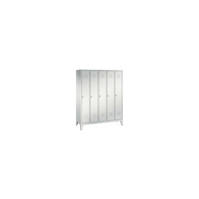 Armadietto guardaroba CLASSIC, con piedini, 5 vani, larghezza vani 300 mm, grigio chiaro. Fornitura = montato. Altezza = 1850 mm. Profondità = 500 mm. Larghezza = 1500 mm. Colore corpo = grigio chiaro RAL 7035. Colore porta = grigio chiaro RAL 7035. Serratura = chiavistello girevole predisposto per lucchetto. Numero scomparti in larghezza = 5 pz. Larghezza scomparti = 300 mm. Materiale = lamiera d'acciaio. Dotazione interna = 1 ripiano, 1 asta appendiabiti con 3 ganci scorrevoli. Larghezza interna = 230 mm. Altezza interna = 1600 mm. Profondità interna = 465 mm. Tipo di porta = anta a battente. Altezza piedini = 150 mm. Struttura = con saldatura. Superficie = verniciatura. Struttura in acciaio di lunga durata. Angolo di apertura anta 110°. Alta resistenza ai raggi UV e alla corrosione. Piedini dell'armadio in plastica, quindi elevata protezione dell'armadio dalla corrosione. Corpo in robusta struttura d'acciaio con verniciatura a forno di alta qualità per un'elevata resistenza ai raggi