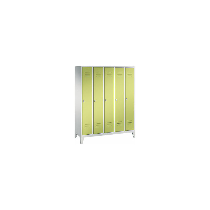 Armadietto guardaroba CLASSIC, con piedini, 5 vani, larghezza vani 300 mm, grigio chiaro / verdino. Fornitura = montato. Altezza = 1850 mm. Profondità = 500 mm. Larghezza = 1500 mm. Colore corpo = grigio chiaro RAL 7035. Colore porta = verde azzurrognolo RDS 1108060. Serratura = chiavistello girevole predisposto per lucchetto. Numero scomparti in larghezza = 5 pz. Larghezza scomparti = 300 mm. Materiale = lamiera d'acciaio. Dotazione interna = 1 ripiano, 1 asta appendiabiti con 3 ganci scorrevoli. Larghezza interna = 230 mm. Altezza interna = 1600 mm. Profondità interna = 465 mm. Tipo di porta = anta a battente. Altezza piedini = 150 mm. Struttura = con saldatura. Superficie = verniciatura. Struttura in acciaio di lunga durata. Angolo di apertura anta 110°. Alta resistenza ai raggi UV e alla corrosione. Piedini dell'armadio in plastica, quindi elevata protezione dell'armadio dalla corrosione. Corpo in robusta struttura d'acciaio con verniciatura a forno di alta qualità per un'elevata