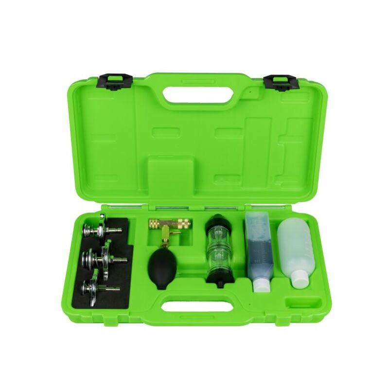 Questo strumento è progettato per verificare la presenza di perdite tra la combustione e il sistema di raffreddamento dei motori raffreddati ad acqua. Il processo di combustione produce (tra gli altri gas) il 13-14% di CO2 nello scarico e le perdite di questo gas nel sistema di refrigerazione sono facilmente rilevabili. Se ci sono gas di combustione, il colore del liquido di prova cambierà in giallo o verde e ciò sarà la prova della perdita di CO2 nel refrigerante. Contiene: - Bottiglia rotonda da 200 ml - Flacone quadrato da 250 ml - Adattatori: Piccolo: Suzuki, Toyota, Mitsubishi Mezzo: Suzuki, Toyota, Mitsubishi, Subaru, Peugeot, Nissan, Lexus, Mazda, Grande: Ford / GM / Benz / JEEP
