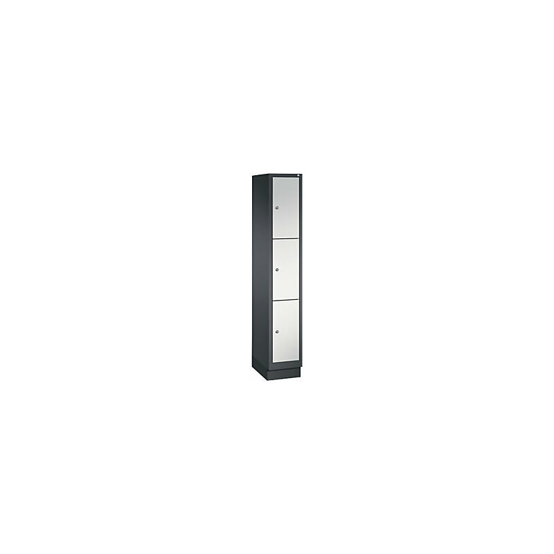 Armadio a scomparti CLASSIC, con zoccolino, 1 vano, 3 scomparti, larghezza vano 300 mm, grigio nerastro / grigio chiaro. Fornitura = montato. Altezza = 1800 mm. Profondità = 500 mm. Larghezza = 320 mm. Colore corpo = grigio nerastro RAL 7021. Colore porta = grigio chiaro RAL 7035. Serratura = serratura a cilindro differenziata. Numero scomparti = 3 pz. Larghezza scomparti = 300 mm. Materiale = lamiera d'acciaio. Dotazione interna = senza dotazione interna. Larghezza interna = 230 mm. Altezza interna = 510 mm. Profondità interna = 465 mm. Tipo di porta = anta a battente. Numero chiavi = 2 pz. Altezza scomparti = 540 mm. Larghezza ripiani = 300 mm. Profondità ripiani = 500 mm. Altezza zoccolo = 100 mm. Struttura = con saldatura. Superficie = verniciatura. Struttura in acciaio di lunga durata. 1 serratura a cilindro per scomparto, ognuna con 2 chiavi. Angolo di apertura anta 110°. Verniciatura a forno di qualità per elevata resistenza ai raggi UV e alla corrosione. Zoccolino arretrato per
