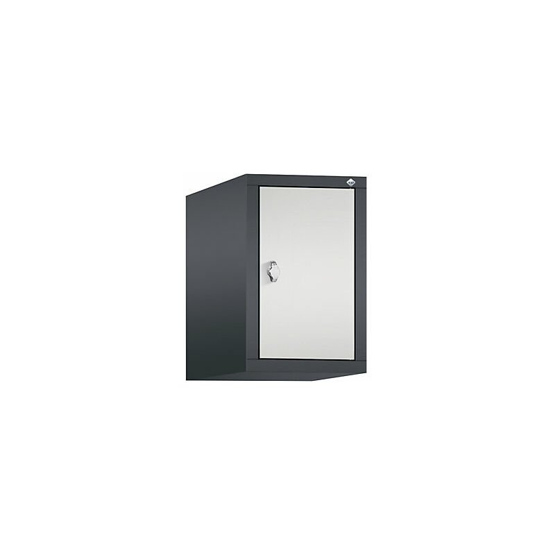 Armadietto sovrapponibile CLASSIC, 1 vano, larghezza vano 300 mm, grigio nerastro / grigio chiaro. Fornitura = montato. Altezza = 500 mm. Profondità = 500 mm. Larghezza = 320 mm. Colore corpo = grigio nerastro RAL 7021. Colore porta = grigio chiaro RAL 7035. Serratura = chiavistello girevole predisposto per lucchetto. Numero scomparti in larghezza = 1 pz. Numero scomparti = 1 pz. Larghezza scomparti = 300 mm. Materiale = lamiera d'acciaio. Altezza armadietto = 500 mm. Dotazione interna = senza dotazione interna. Larghezza interna = 230 mm. Altezza interna = 430 mm. Profondità interna = 465 mm. Tipo di porta = anta a battente. Altezza scomparti = 500 mm. Larghezza ripiani = 300 mm. Profondità ripiani = 500 mm. Struttura = con saldatura. Superficie = verniciatura. Struttura in acciaio di lunga durata. Angolo di apertura anta 110°. Verniciatura a forno di qualità per elevata resistenza ai raggi UV e alla corrosione. Ammortizzatore battuta anta di serie. Chiavistello girevole per lucchetto