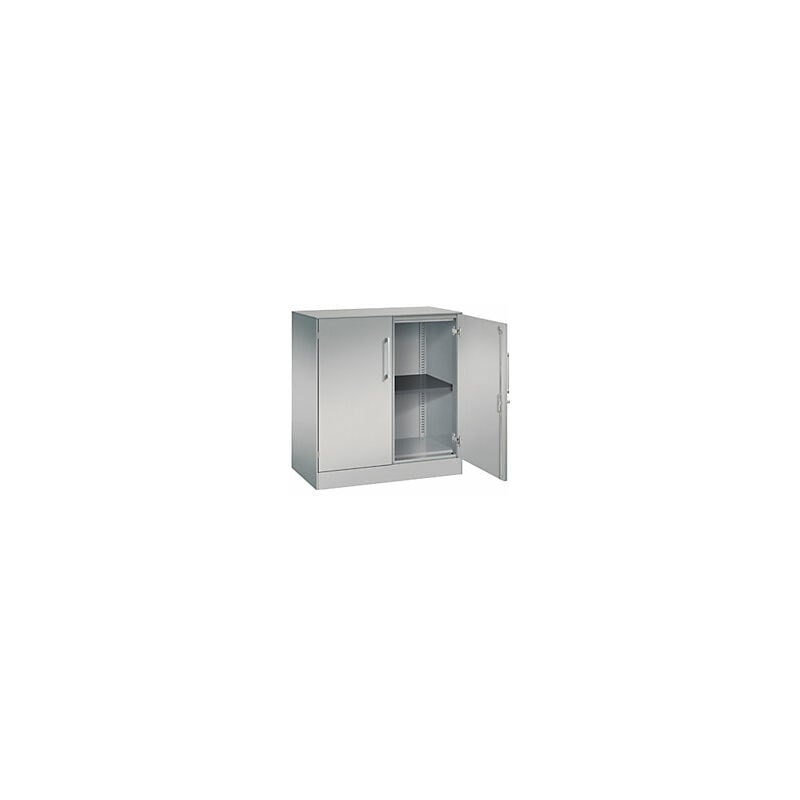 Armadio con ante a battente ASISTO, altezza 897 mm, larghezza 800 mm, 1 ripiano, alluminio brillante/alluminio brillante. Fornitura = montato. Larghezza = 800 mm. Altezza = 897 mm. Profondità = 435 mm. Colore corpo = alluminio brillante RAL 9006. Materiale = lamiera d'acciaio. Tipo di prodotto = armadi con ante a battente. Tipo di porta = anta a battente. Colore porta = alluminio brillante RAL 9006. Numero ante = 2 pz. Numero ripiani = 1 pz. Materiale ripiani = acciaio. Colore ripiani = grigio nerastro. Portata per ripiano = 70 kg. Caratteristiche = con serratura. Serratura = serratura a cilindro. Numero file raccoglitori = 2 pz. Dotazione interna = 1 ripiano. Passo di regolazione altezza ripiani = 15 mm. Altezza zoccolo = 90 mm. Angolo di apertura delle porte = 225 °. Spessore ripiani = 24 mm. Spessore del corpo = 0.88 mm. Spessore porta = 19 mm. Corpo in robusta costruzione d'acciaio con verniciatura a forno di alta qualità per un'elevata resistenza ai raggi UV. Design elegante con