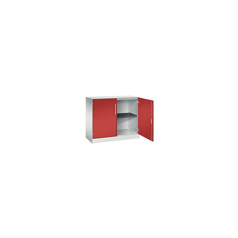 Armadio con ante a battente ASISTO, altezza 897 mm, larghezza 1000 mm, 1 ripiano, grigio chiaro/rosso fuoco. Fornitura = montato. Larghezza = 1000 mm. Altezza = 897 mm. Profondità = 435 mm. Colore corpo = grigio chiaro RAL 7035. Materiale = lamiera d'acciaio. Tipo di prodotto = armadi con ante a battente. Tipo di porta = anta a battente. Colore porta = rosso fuoco RAL 3000. Numero ante = 2 pz. Numero ripiani = 1 pz. Materiale ripiani = acciaio. Colore ripiani = grigio nerastro. Portata per ripiano = 70 kg. Caratteristiche = con serratura. Serratura = serratura a cilindro. Numero file raccoglitori = 2 pz. Dotazione interna = 1 ripiano. Passo di regolazione altezza ripiani = 15 mm. Altezza zoccolo = 90 mm. Angolo di apertura delle porte = 225 °. Spessore ripiani = 24 mm. Spessore del corpo = 0.88 mm. Spessore porta = 19 mm. Corpo in robusta costruzione d'acciaio con verniciatura a forno di alta qualità per un'elevata resistenza ai raggi UV. Design elegante con effetto filigrana. Ante a