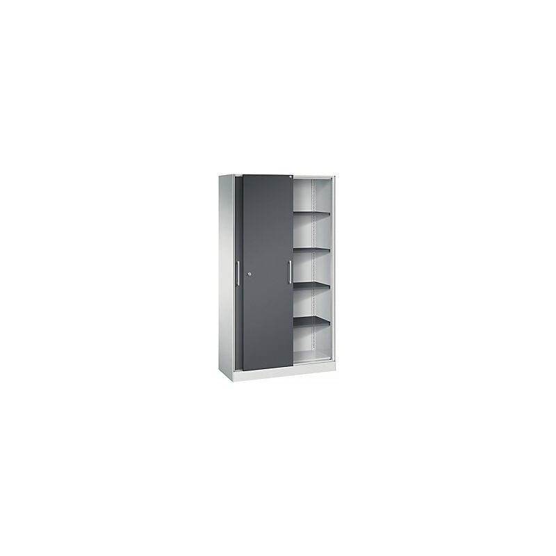 Armadio con ante scorrevoli ASISTO, altezza 1980 mm, larghezza 1000 mm, grigio chiaro/grigio nerastro. Fornitura = montato. Larghezza = 1000 mm. Altezza = 1980 mm. Profondità = 435 mm. Colore corpo = grigio chiaro RAL 7035. Materiale = lamiera d'acciaio. Tipo di prodotto = armadi con ante scorrevoli. Tipo di porta = porta scorrevole. Colore porta = grigio nerastro RAL 7021. Numero ante = 2 pz. Numero ripiani = 4 pz. Materiale ripiani = acciaio. Colore ripiani = grigio nerastro RAL 7021. Portata per ripiano = 70 kg. Caratteristiche = con serratura. Serratura = serratura a cilindro girevole a pressione, serratura a cilindro a leva. Numero file raccoglitori = 5 pz. Dotazione interna = 4 ripiani. Passo di regolazione altezza ripiani = 15 mm. Altezza zoccolo = 90 mm. Spessore ripiani = 24 mm. Spessore del corpo = 0.88 mm. Spessore porta = 19 mm. Corpo in robusta costruzione d'acciaio con verniciatura a forno di alta qualità per un'elevata resistenza ai raggi UV. Design elegante con effetto
