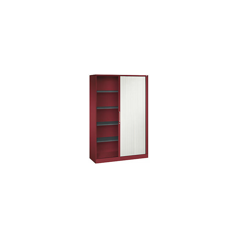 Armadio con serranda ASISTO, altezza 1980 mm, larghezza 1200 mm, rosso rubino/bianco traffico. Fornitura = montato. Altezza = 1980 mm. Larghezza = 1200 mm. Profondità = 435 mm. Colore corpo = rosso rubino RAL 3003. Materiale corpo = lamiera d'acciaio, verniciata a polvere. Colore serranda = bianco traffico RAL 9016. Caratteristiche = con serratura. Serratura = serratura a cilindro. Numero file raccoglitori = 5 pz. Materiale serranda = plastica. Dotazione interna = 4 ripiani. Numero ripiani = 4 pz. Portata per ripiano = 50 kg. Colore ripiani = grigio nerastro RAL 7021. Tipo di porta = serrande. Passo di regolazione altezza ripiani = 15 mm. Larghezza interna = 1095 mm. Altezza interna = 1865 mm. Profondità interna = 365 mm. Spessore ripiani = 24 mm. Spessore del corpo = 0.88 mm. Altezza zoccolo = 90 mm. Serrande scorrevoli e silenziose su guide leggere. Alta flessibilità grazie alla dotazione interna regolabile in altezza con passo di 15 mm. Serratura con blocco a gancio con nucleo