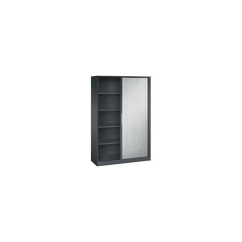 Armadio con serranda ASISTO, altezza 1980 mm, larghezza 1200 mm, grigio nerastro/alluminio brillante. Fornitura = montato. Altezza = 1980 mm. Larghezza = 1200 mm. Profondità = 435 mm. Colore corpo = grigio nerastro RAL 7021. Materiale corpo = lamiera d'acciaio, verniciata a polvere. Colore serranda = alluminio brillante RAL 9006. Caratteristiche = con serratura. Serratura = serratura a cilindro. Numero file raccoglitori = 5 pz. Materiale serranda = plastica. Dotazione interna = 4 ripiani. Numero ripiani = 4 pz. Portata per ripiano = 50 kg. Colore ripiani = grigio nerastro RAL 7021. Tipo di porta = serrande. Passo di regolazione altezza ripiani = 15 mm. Larghezza interna = 1095 mm. Altezza interna = 1865 mm. Profondità interna = 365 mm. Spessore ripiani = 24 mm. Spessore del corpo = 0.88 mm. Altezza zoccolo = 90 mm. Serrande scorrevoli e silenziose su guide leggere. Alta flessibilità grazie alla dotazione interna regolabile in altezza con passo di 15 mm. Serratura con blocco a gancio