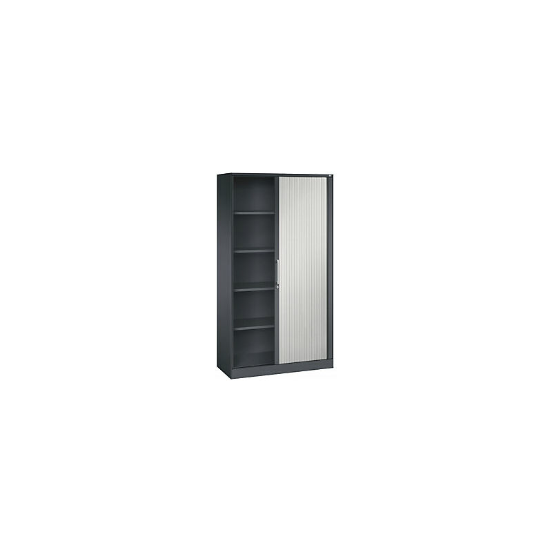 Armadio con serranda ASISTO, altezza 1980 mm, larghezza 1000 mm, grigio nerastro/grigio chiaro. Fornitura = montato. Altezza = 1980 mm. Larghezza = 1000 mm. Profondità = 435 mm. Colore corpo = grigio nerastro RAL 7021. Materiale corpo = lamiera d'acciaio, verniciata a polvere. Colore serranda = grigio chiaro RAL 7035. Caratteristiche = con serratura. Serratura = serratura a cilindro. Numero file raccoglitori = 5 pz. Materiale serranda = plastica. Dotazione interna = 4 ripiani. Numero ripiani = 4 pz. Portata per ripiano = 50 kg. Colore ripiani = grigio nerastro RAL 7021. Tipo di porta = serrande. Passo di regolazione altezza ripiani = 15 mm. Larghezza interna = 895 mm. Altezza interna = 1865 mm. Profondità interna = 365 mm. Spessore ripiani = 24 mm. Spessore del corpo = 0.88 mm. Altezza zoccolo = 90 mm. Serrande scorrevoli e silenziose su guide leggere. Alta flessibilità grazie alla dotazione interna regolabile in altezza con passo di 15 mm. Serratura con blocco a gancio con nucleo