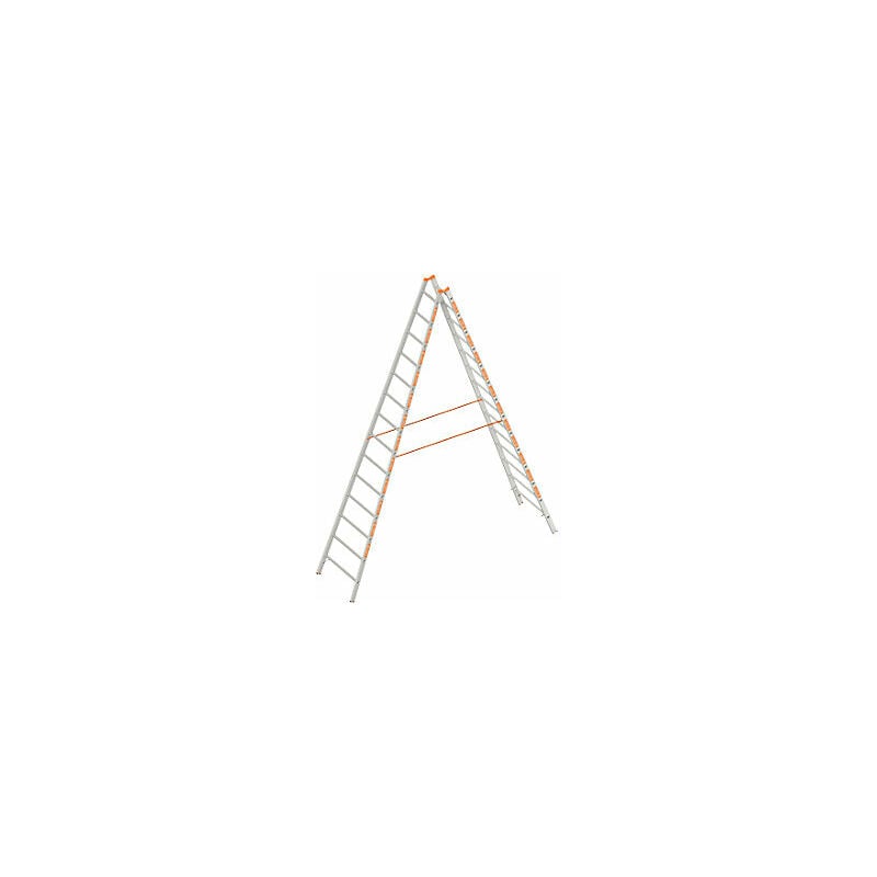 Scala a libro con pioli, salita su ambo i lati, 2 x 14 pioli. Fornitura = montato. Tipo di prodotto = scale a libro con pioli. Salita = su due lati. Versione da salita = pioli. Numero pioli = 2x14 pz. Peso = 18.8 kg. Materiale telaio = alluminio. Materiale gradini = alluminio. Altezza verticale = 4100 mm. Profondità gradini = 30 mm. Caratteristiche = pieghevole. Altezza di lavoro = 5150 mm. Altezza di salita = 3150 mm. Portata = 150 kg. Cerniere in acciaio rivestite in plastica. Sicurezza antidivaricamento con cinghie antistrappo in poliestere. Piedini antiscivolo COMBIGRIP con speciale superficie di appoggio. Le scale in alluminio si contraddistinguono per robustezza, durata e peso ridotto. I pioli sono costituiti da profili estrusi chiusi ad alta resistenza senza saldature longitudinali, pressati 4 volte nel montante. La forma triangolare del piolo protegge dalla torsione, la compressione garantisce un'elevata stabilità laterale della scala. I pioli hanno una superficie scanalata per