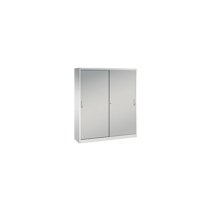 Armadio con ante scorrevoli ACURADO, 6 ripiani, 2 scomparti con serratura, alt. x largh. x prof. 1950 x 1600 x 400 mm, grigio chiaro / alluminio brillante. Fornitura = montato. Larghezza = 1600 mm. Altezza = 1950 mm. Profondità = 400 mm. Colore corpo = grigio chiaro RAL 7035. Materiale = acciaio. Tipo di prodotto = armadi con ante scorrevoli. Tipo di porta = porta scorrevole. Colore porta = alluminio brillante RAL 9006. Numero ante = 2 pz. Numero ripiani = 2x3 pz. Materiale ripiani = acciaio, con verniciatura a forno. Colore ripiani = grigio chiaro RAL 7035. Portata per ripiano = 70 kg. Caratteristiche = con serratura. Serratura = serratura a cilindro girevole a pressione, serratura a cilindro a leva. Numero file raccoglitori = 5 pz. Dotazione interna = 6 ripiani, 2 scomparti con serratura, parete divisoria centrale. Passo di regolazione altezza ripiani = 15 mm. Altezza zoccolo = 100 mm. Spessore ripiani = 24 mm. Spessore del corpo = 0.88 mm. Spessore porta = 19 mm. Ante scorrevoli in