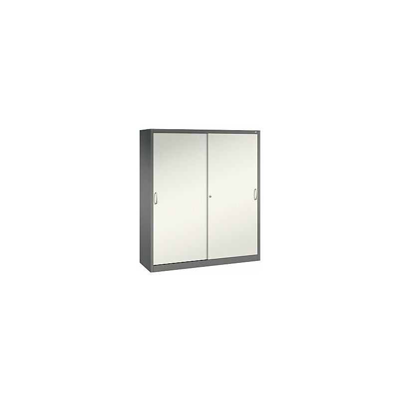 Armadio con ante scorrevoli ACURADO, 6 ripiani, 2 scomparti con serratura, alt. x largh. x prof. 1950 x 1600 x 500 mm, grigio vulcano / bianco perla. Fornitura = montato. Larghezza = 1600 mm. Altezza = 1950 mm. Profondità = 500 mm. Colore corpo = grigio vulcano RDS 0005000. Materiale = acciaio. Tipo di prodotto = armadi con ante scorrevoli. Tipo di porta = porta scorrevole. Colore porta = bianco perla RAL 1013. Numero ante = 2 pz. Numero ripiani = 2x3 pz. Materiale ripiani = acciaio, con verniciatura a forno. Colore ripiani = grigio chiaro RAL 7035. Portata per ripiano = 70 kg. Caratteristiche = con serratura. Serratura = serratura a cilindro girevole a pressione, serratura a cilindro a leva. Numero file raccoglitori = 5 pz. Dotazione interna = 6 ripiani, 2 scomparti con serratura, parete divisoria centrale. Passo di regolazione altezza ripiani = 15 mm. Altezza zoccolo = 100 mm. Spessore ripiani = 24 mm. Spessore del corpo = 0.88 mm. Spessore porta = 19 mm. Ante scorrevoli in acciaio