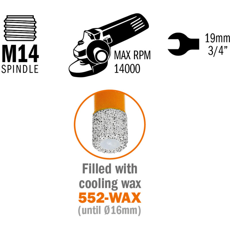 SEGA TAZZA DIA PER GRES/MARMO/GRANITO S=M14 D=20x15/35x60 DX SUGGERIMENTI DI UTILIZZO: Iniziate la foratura (con l'utensile già in rotazione) con un angolo di circa 30° tra la sega a tazza e il piano, in questo modo eviterete lo slittamento dell'utensile e otterrete un centraggio più preciso (in questa fase appoggiate la macchina al piano, in modo d'avere più stabilità). Continuate la foratura verticalmente ma accompagnando l'utensile con un movimento orbitale che favorisca il raffreddamento e l'evacuazione del materiale lavorato (se utilizzate la guida iniziate la foratura verticalmente, poi toglietela e continuate in maniera orbitale). Ricordate che non si tratta di una punta, ma di una fresa, quindi una foratura perfettamente perpendicolare ridurrà notevolmente la vita dell'utensile. Il raffreddamento ad acqua può aumentare la vita dell'utensile. Disattivare il meccanismo a percussione. Guarda i video nella playlist