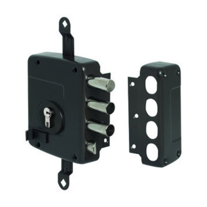 Art. 56167.60.1 chiusura triplice con scrocco e 3 catenacci. Comando interno con chiave o leva. Mano DX Scatola verniciata mm 123x150 Entrata 64 mm Fornita senza aste e senza cilindro.