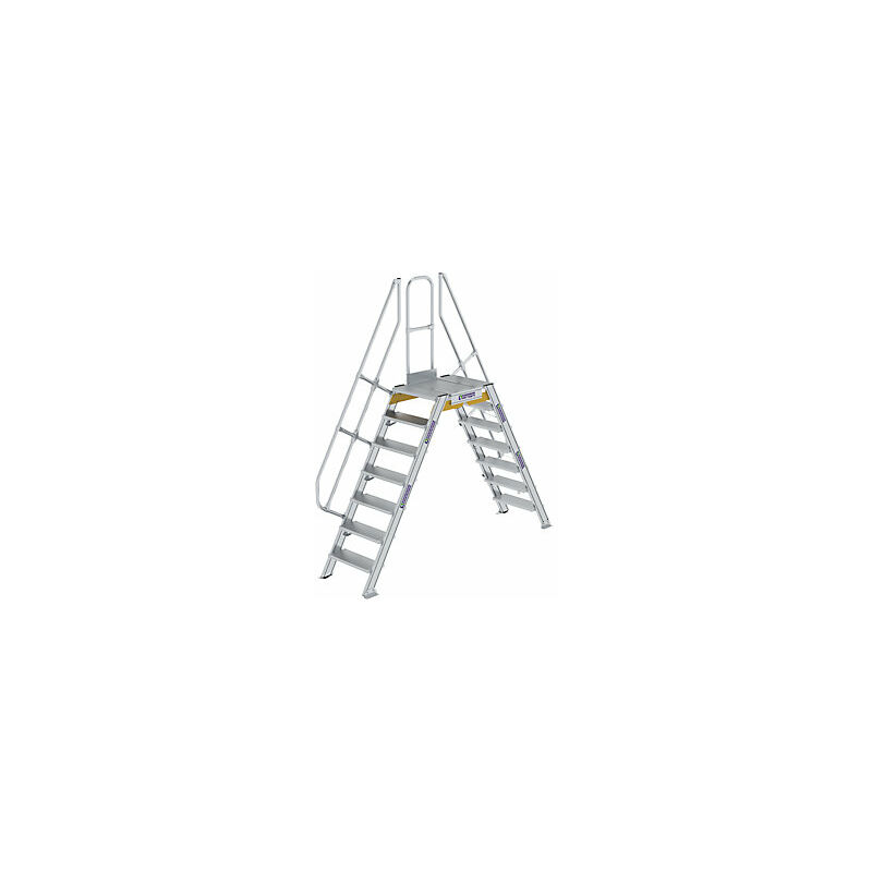 Ponte, portata totale 300 kg, 7 gradini, piattaforma 800 x 600 mm. Fornitura = montato. Tipo di prodotto = ponti a scala. Altezza utile = 1658 mm. N. gradini, piattaforma inclusa = 7 pz. Sbraccio = 2912 mm. Materiale telaio = profilato estruso in alluminio. Materiale gradini = alluminio, striato. Profondità gradini = 200 mm. Angolo d'inclinazione = 60°. Portata totale = 300 kg. Lunghezza piattaforma = 800 mm. Larghezza piattaforma = 600 mm. Larghezza gradini = 600 mm. Per il passaggio su macchine, nastri trasportatori o fosse. Per lavorare in modo sicuro e senza fatica, anche per lungo tempo. Comoda salita, angolo d'inclinazione di 60°. Portata totale 300 kg. Estremità inferiore montanti con piedini in profilato angolare per il fissaggio a terra. Estremità superiori dei montanti chiuse e assemblate a vite ai profili della piattaforma. Gradini chiusi antitorsione. Un parapetto alto 1100 mm in dotazione, da montare a destra o a sinistra. Secondo parapetto come accessorio. Viene