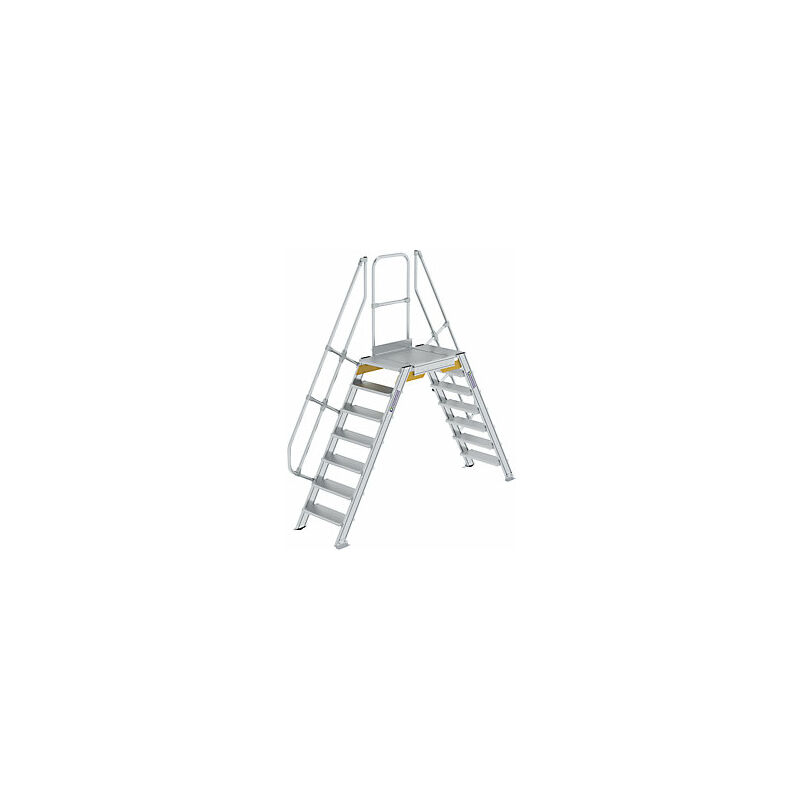 Ponte, portata totale 300 kg, 7 gradini, piattaforma 1200 x 600 mm. Fornitura = montato. Tipo di prodotto = ponti a scala. Altezza utile = 1658 mm. N. gradini, piattaforma inclusa = 7 pz. Sbraccio = 3120 mm. Materiale telaio = profilato estruso in alluminio. Materiale gradini = alluminio, striato. Profondità gradini = 200 mm. Angolo d'inclinazione = 60°. Portata totale = 300 kg. Lunghezza piattaforma = 1200 mm. Larghezza piattaforma = 600 mm. Larghezza gradini = 600 mm. Per il passaggio su macchine, nastri trasportatori o fosse. Per lavorare in modo sicuro e senza fatica, anche per lungo tempo. Comoda salita, angolo d'inclinazione di 60°. Portata totale 300 kg. Estremità inferiore montanti con piedini in profilato angolare per il fissaggio a terra. Estremità superiori dei montanti chiuse e assemblate a vite ai profili della piattaforma. Gradini chiusi antitorsione. Un parapetto alto 1100 mm in dotazione, da montare a destra o a sinistra. Secondo parapetto come accessorio. Viene