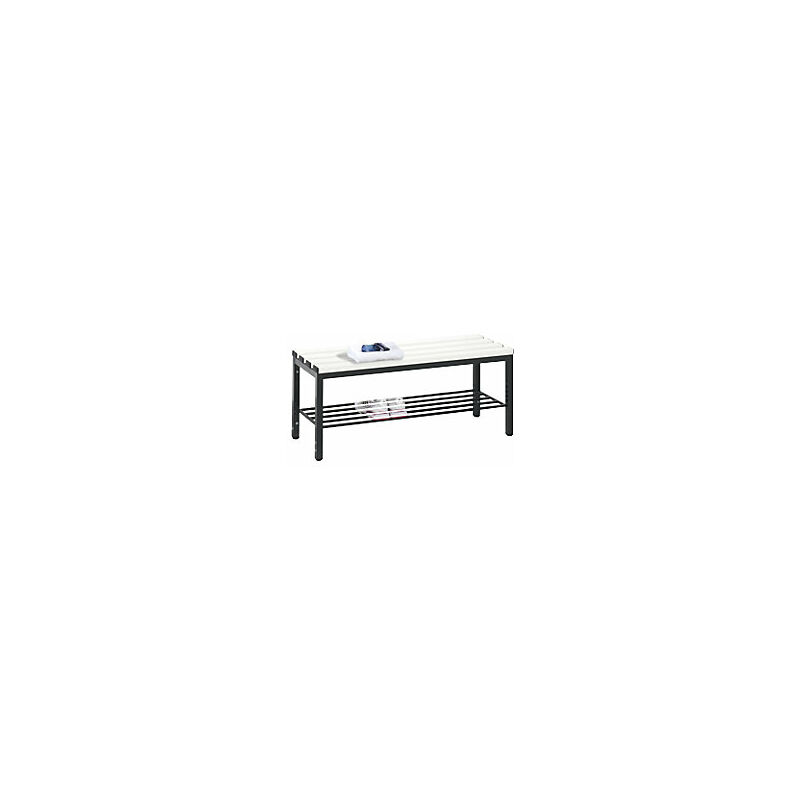 Panca per spogliatoi BASIC, con ripiano per scarpe, plastica, lunghezza 1000 mm, bianco puro. Fornitura = montato. Lunghezza = 1000 mm. Altezza sedile = 420 mm. Profondità sedile = 350 mm. Colore telaio = grigio nerastro RAL 7021. Materiale telaio = tubo d'acciaio a sezione quadra. Profondità totale = 350 mm. Materiale doghe = plastica. Colore doghe = bianco puro RAL 9010. Altezza totale = 420 mm. Versione panchina = con ripiano scarpe. Numero doghe = 4 pz. Versione telaio = struttura in tubi d'acciaio. Campo di regolazione altezza = 10 mm. Caratteristiche = ideale in ambienti umidi, altezza regolabile. Portata max. = 375 kg. Tipo di prodotto = panche per spogliatoi. Ideali in ambienti umidi. Panca autoportante, telaio con 4 piedi in robusto tubo d'acciaio quadrato 30 x 30 mm, con piedini regolabili per la semplice messa in piano. Telaio grigio nerastro RAL 7021. Doghe profilate in plastica con anima in acciaio per elevata stabilità. Con ripiano per scarpe. La portata massima vale solo