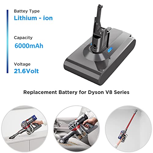 【2023 Nuova Batteria di Aggiornamento per Dyson V8】Batteria di ricambio per Dyson V8. Capacità: 6000mAh. Realizzata con celle di batteria al litio di alta qualità con un alto, Funziona come la batteria originale V8, fornisce un'eccellente potenza di aspirazione e più tempo di funzionamento per il vostro vuoto.