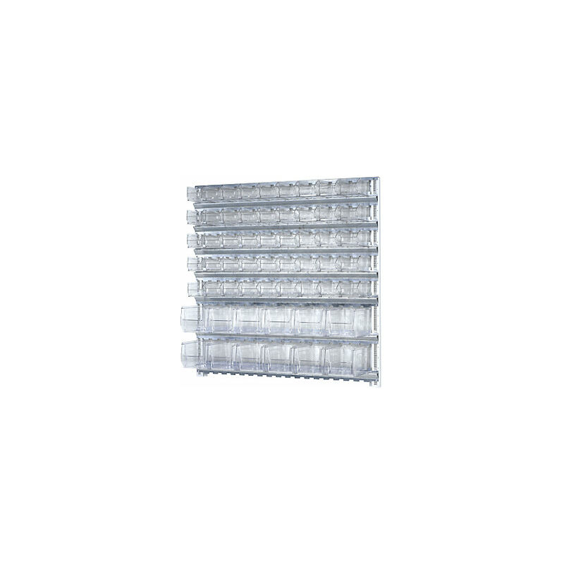 Scaffale a muro modulare con cassettine, 7 guide, 57 cassette, alt. x largh. 1000 x 1010 mm. Fornitura = smontato. Larghezza = 1010 mm. Altezza = 1000 mm. Cassettine numero / lungh. x largh. x alt. = 45 pz. lungh. x largh. x alt. 160x100x75 mm, 12 pz. lungh. x largh. x alt. 230x150x130 mm. Tipo di cassette = cassettina per magazzinaggio. Materiale cassettine = stirele acrilonitrile. Materiale = acciaio. Superficie = zincatura. Colore telaio = zincatura. Numero guide = 7 pz. Colore cassettine = trasparente. Tipo di prodotto = accessori. Per avere tutto a portata di mano sul posto di lavoro. I supporti del sistema di scaffalatura a muro sono profilati a C zincati da montare in verticale. Le guide zincate vengono montate orizzontalmente, per agganciare le cassettine. Supporti con profilo a C e guide compresi nella fornitura. Materiale di fissaggio in dotazione.