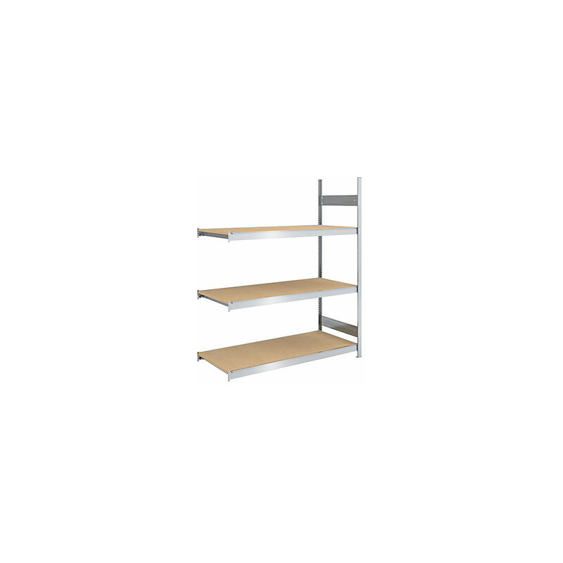 Scaffale a innesto con ripiani lunghi in pannelli di truciolato, altezza 2000 mm, larghezza 1500 mm, portata campata 1200 kg, profondità 800 mm, scaffale aggiuntivo. Fornitura = smontato. Altezza scaffale = 2000 mm. Tipo di scaffale = scaffale aggiuntivo. Materiale = acciaio, zincato. Struttura = a innesto. Profondità totale = 835 mm. Larghezza totale = 1520 mm. Portata campata = 1200 kg. Portata ripiani = 350 kg. Materiale ripiani = pannello in truciolato, V20, E1. Profondità ripiani = 800 mm. Larghezza ripiani = 1500 mm. Numero ripiani = 3 pz. Tipo di prodotto = scaffali a innesto a campata larga. Magazzinaggio flessibile grazie a un rapido montaggio a innesto. Ottimo sfruttamento dello spazio. Ripiani in truciolato, di ottima qualità inseriti a filo (categoria V 20/E1, spessore 19 mm), nelle larghezze: 1125, 1250, 1500 e 2000 mm. Componenti zincati. Dimensioni esterne Scaffale portante: larghezza ripiano + 70 mm, profondità ripiano + 35 mm. Scaffale aggiuntivo: larghezza