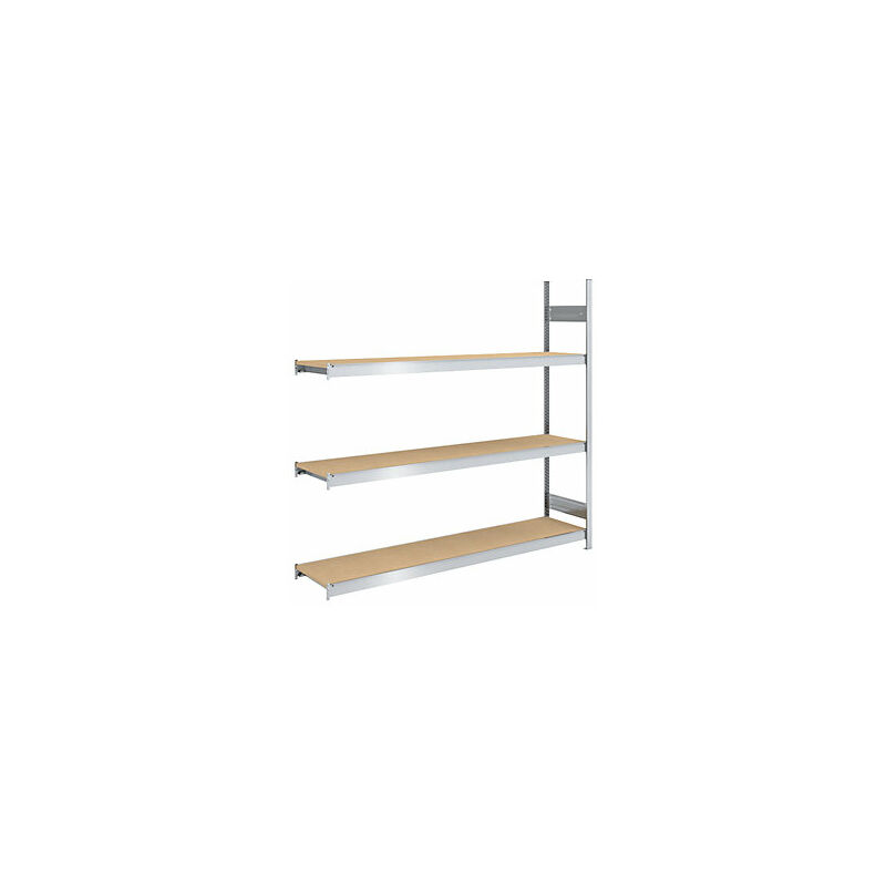 Scaffale a innesto con ripiani lunghi in pannelli di truciolato, altezza 2000 mm, larghezza 2000 mm, portata campata 1200 kg, profondità 500 mm, scaffale aggiuntivo. Fornitura = smontato. Altezza scaffale = 2000 mm. Tipo di scaffale = scaffale aggiuntivo. Materiale = acciaio, zincato. Struttura = a innesto. Profondità totale = 535 mm. Larghezza totale = 2020 mm. Portata campata = 1200 kg. Portata ripiani = 350 kg. Materiale ripiani = pannello in truciolato, V20, E1. Profondità ripiani = 500 mm. Larghezza ripiani = 2000 mm. Numero ripiani = 3 pz. Tipo di prodotto = scaffali a innesto a campata larga. Magazzinaggio flessibile grazie a un rapido montaggio a innesto. Ottimo sfruttamento dello spazio. Ripiani in truciolato, di ottima qualità inseriti a filo (categoria V 20/E1, spessore 19 mm), nelle larghezze: 1125, 1250, 1500 e 2000 mm. Componenti zincati. Dimensioni esterne Scaffale portante: larghezza ripiano + 70 mm, profondità ripiano + 35 mm. Scaffale aggiuntivo: larghezza