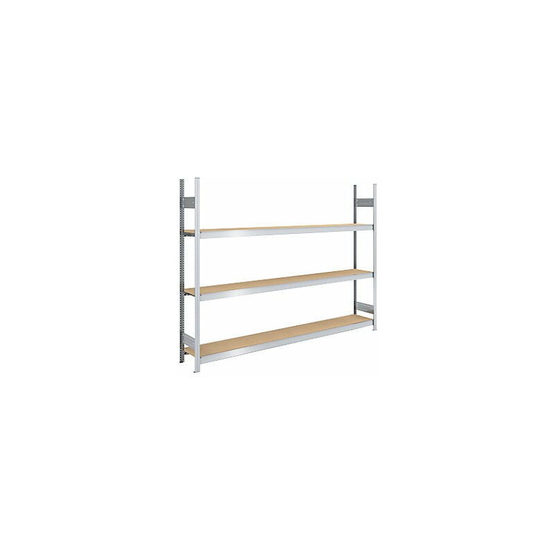 Scaffale a innesto con ripiani lunghi in pannelli di truciolato, altezza 2000 mm, larghezza 2500 (2 x 1250) mm, portata campata 1200 kg, profondità 400 mm, scaffale portante. Fornitura = smontato. Altezza scaffale = 2000 mm. Tipo di scaffale = scaffale portante. Materiale = acciaio, zincato. Struttura = a innesto. Profondità totale = 435 mm. Larghezza totale = 2570 mm. Portata campata = 1200 kg. Portata ripiani = 350 kg. Materiale ripiani = pannello in truciolato, V20, E1. Profondità ripiani = 400 mm. Larghezza ripiani = 2500 mm. Numero ripiani = 3 pz. Tipo di prodotto = scaffali a innesto a campata larga. Magazzinaggio flessibile grazie a un rapido montaggio a innesto. Ottimo sfruttamento dello spazio. Ripiani in truciolato, di ottima qualità inseriti a filo (categoria V 20/E1, spessore 19 mm), nelle larghezze: 1125, 1250, 1500 e 2000 mm. Componenti zincati. Dimensioni esterne Scaffale portante: larghezza ripiano + 70 mm, profondità ripiano + 35 mm. Scaffale aggiuntivo