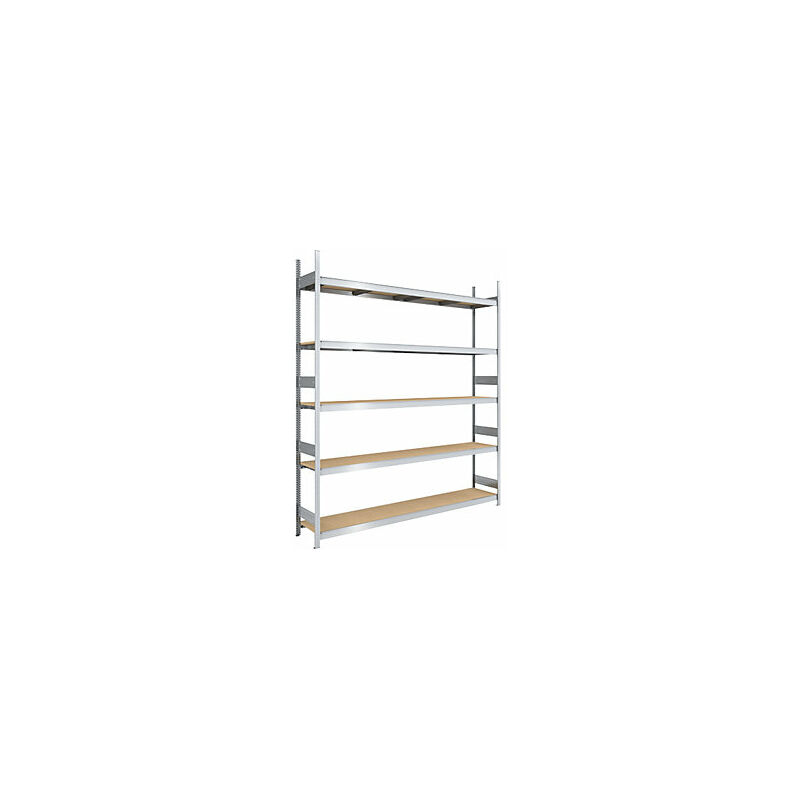 Scaffale a innesto con ripiani lunghi in pannelli di truciolato, altezza 3000 mm, larghezza 2500 (2 x 1250) mm, portata campata 2000 kg, profondità 500 mm, scaffale portante. Fornitura = smontato. Altezza scaffale = 3000 mm. Tipo di scaffale = scaffale portante. Materiale = acciaio, zincato. Struttura = a innesto. Profondità totale = 535 mm. Larghezza totale = 2570 mm. Portata campata = 2000 kg. Portata ripiani = 350 kg. Materiale ripiani = pannello in truciolato, V20, E1. Profondità ripiani = 500 mm. Larghezza ripiani = 2500 mm. Numero ripiani = 5 pz. Tipo di prodotto = scaffali a innesto a campata larga. Magazzinaggio flessibile grazie a un rapido montaggio a innesto. Ottimo sfruttamento dello spazio. Ripiani in truciolato, di ottima qualità inseriti a filo (categoria V 20/E1, spessore 19 mm), nelle larghezze: 1125, 1250, 1500 e 2000 mm. Componenti zincati. Dimensioni esterne Scaffale portante: larghezza ripiano + 70 mm, profondità ripiano + 35 mm. Scaffale aggiuntivo