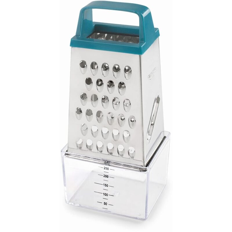 Grattugia a 4 lati con contenitore KEEP in acciaio inox di altissima. È robusto e altamente resistente. Ha 4 lati di diversi tagli per ottenere il tipo di griglia desiderato: fine, medio, spesso e affettato. È progettato per grattugiare e affettare tutti i tipi di alimenti come formaggio, verdure, noce moscata, cioccolato, ecc. Include contenitore per raccogliere cibo. Contrassegnato in ml e tazze. Ha un manico ergonomico in faggio naturale per una presa e utilizzo. Pratico e molto facile da riporre. Queste sono le sue dimensioni: 8,9x6,5x20,5 cm. La capacità del contenitore è di 250 ml.
