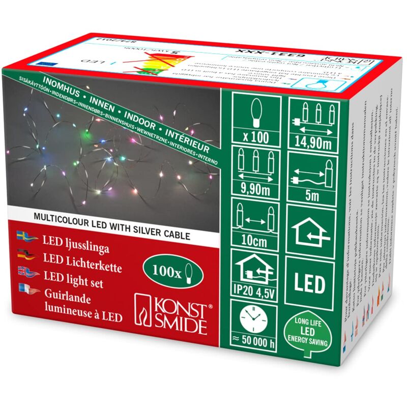 Set di luci a LED a grappolo, un filo con 100 diodi RGB che cambiano colore, trasformatore interno da 4,5 V, filo color argento, questo set di luci può essere utilizzato per creare un display molto speciale, utilizzare su composizioni floreali, piccoli alberi e ghirlande per creare una splendida illuminazione d'atmosfera. Lunghezza cavo: 500 cm, lunghezza della luce: 990 cm, distanza tra i LED: 10 cm.