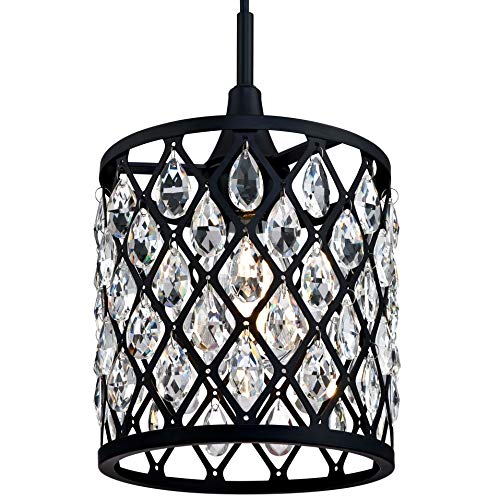 Il paralume intagliato di lattice nero opaco fornisce il contrasto perfetto per i cristalli trasparenti, dando a questo mini-apparecchio di illuminazione a sospensione un fascino di tendenza