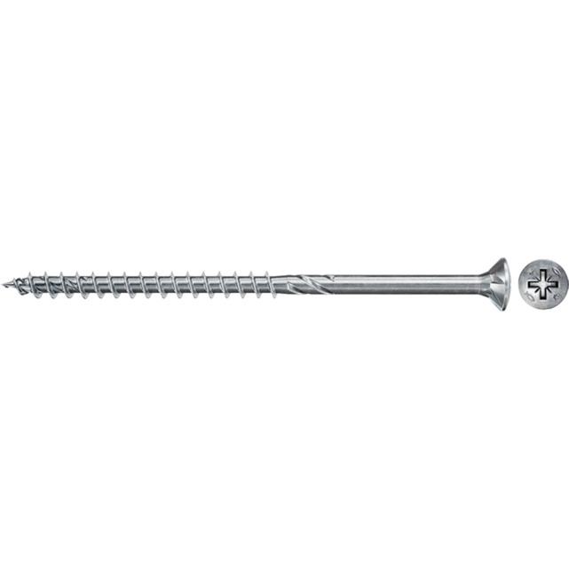 La fischer Power-Fast II FPF II CZP BC è una vite zincata passivata blu con filettatura parziale e slot Phillips PZ 2. La zincatura galvanica non contiene alcun contenuto di cromo VI ed è quindi molto rispettosa dell''ambiente. La vite con testa svasata può essere incassata a filo con la superficie nel legno. Il Power-Fast II con rivestimento in cera ad alte prestazioni riduce la coppia avvitabile e consente anche di avvitare vicino al bordo senza problemi. La vite truciolare ha un comportamento di apertura significativamente ridotto rispetto ad altre viti disponibili in commercio. La filettatura parziale lunga 70 mm consente di tirare insieme gli elementi in legno. La vite truciolare è adatta per il fissaggio di componenti portanti in legno rivestito, legno duro, legno tenero e per connessioni in legno o connessioni di parti metalliche su legno, come raccordi metallici, angoli, scarpe trave e altre connessioni in metallo e legno.
