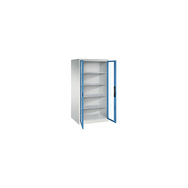 Armadio con ante a battente con finestrella, alt. x largh. x prof. 1950 x 930 x 800 mm, 4 ripiani, grigio chiaro / blu chiaro. Fornitura = montato. Altezza = 1950 mm. Larghezza = 930 mm. Profondità = 800 mm. Larghezza interna = 928 mm. Altezza interna = 1840 mm. Profondità interna = 753 mm. Altezza zoccolo = 100 mm. Struttura = con saldatura. Dotazione interna = 4 ripiani. Portata struttura = 450 kg. Materiale corpo = acciaio. Materiale porta = vetro acrilico, acciaio. Superficie = con verniciatura a forno. Materiale ripiani = lamiera d'acciaio, zincata. Colore corpo = grigio chiaro RAL 7035. Colore porta = blu chiaro RAL 5012. Portata per ripiano = 70 kg. Colore ripiani = argento. Numero ripiani = 4 pz. Larghezza ripiani = 925 mm. Profondità ripiani = 752 mm. Passo di regolazione altezza ripiani = 15 mm. Tipo di porta = ante a battente con finestrella. Versione porta = con finestrella. Angolo di apertura delle porte = 110 °. Armadi per officina con finestrelle per aumentare l'ordine e