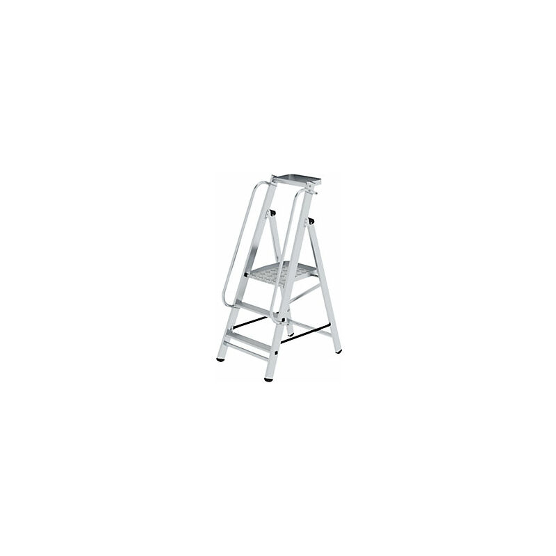 Scala a piattaforma, a innesto, con corrimano, 3 gradini incl. piattaforma. Fornitura = montato. Tipo di prodotto = scale a libro con gradini, salita su un lato. Altezza di lavoro = 2,70 m. Salita = su un lato. Versione da salita = gradini. N. gradini, piattaforma inclusa = 3 pz. Materiale telaio = alluminio. Materiale gradini = alluminio. Profondità gradini = 80 mm. Altezza piattaforma = 690 mm. Peso = 9.5 kg. Portata = 150 kg. Altezza totale = 1430 mm. Due corrimani per salire e scendere in modo sicuro (non montati). Sicurezza antidivaricamento con due resistentissime cinghie in perlon. Salvaspazio per trasporto e stoccaggio. Questa scala a piattaforma in alluminio ha gradini mandorlati, profondi 80 mm e accoppiamenti gradino/montante flangiati 4 volte. La grande piattaforma trapezoidale ha una dimensione di 400 / 360 x 425 mm. La scala può essere ampliata in modo flessibile con elementi inferiori opzionali (accessori disponibili separatamente). La scaletta ha anche di una pratica