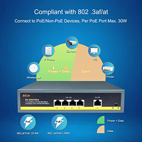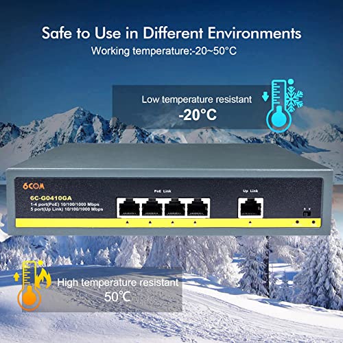 6COMGIGA 5 Port Gigabit PoE Switch with 4 Port PoE+ 100/1000Mbps, 1 Port 100/1000mbps UP Link, 802.3af/at 78W, Built-in Power, Fanless, Unmanaged Plug & Play