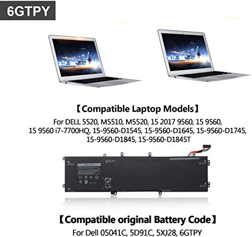 【Replace Part Number】05041C, 5041C, 5D91C, 5XJ28, 6GTPY. Please pay attention to the battery model of your computer before you order it, DELL XPS 9560 notebook has 2 battery models: H5H20 and 6GPTY, due to the size and cell are different, they cannot replace each other!