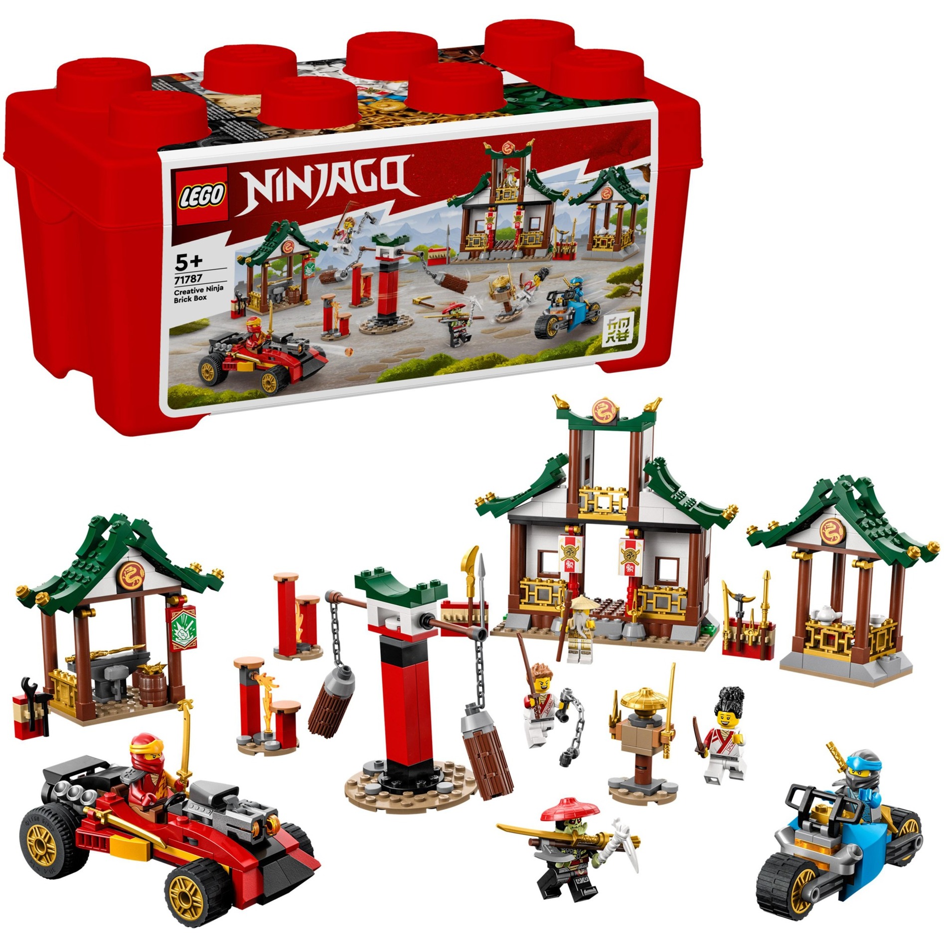 La Creative Ninja Brick Box contiene tutto ciò di cui i fan di Ninjago dall''età di 5 anni hanno bisogno per addestrare i loro eroi e inviarli in innumerevoli avventure emozionanti. Il set di costruzione comprende tre edifici, un percorso a ostacoli con tre stazioni di allenamento interattive, un sacco di equipaggiamento ninja, un''auto ninja e una moto ninja. Sono incluse anche 6 minifigure completamente equipaggiate: Nya, Kai, il Maestro Wu, uno studente ninja, uno studente ninja e il cacciatore di scheletri. Il set si presenta come una scatola di pietra, che è anche un''ottima opzione di archiviazione.