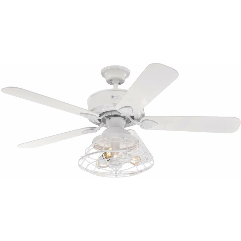 L'estetica industriale del ventilatore da soffitto Barnett Westinghouse da 122 cm presenta un design distintivo che si adatta ad una varietà di stili decorativi casalinghi, da vintage industriale a rustico. il kit di luce con paralume a gabbia e lampadine LED in stile vintage aggiunge un tocco retro. Scegliere tra lame reversibili in pino lavato Bianco o Bianco per completare il look. Numero di riferimento prodotto 72209.