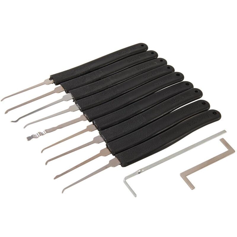 Acciaio inossidabile resistente ma flessibile con impugnature in polimeri.Set leggero e maneggevole per uso domestico e professionale. Per manomettere le serrature quando si perdono le chiavi. Include 9 x ganci/attrezzi appuntiti per serrature e 2 x tensori. In borsello in finta pelle.