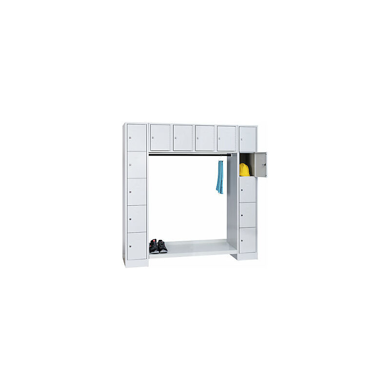 Appendiabiti a sistema modulare, aperto, alt. x largh. totale 1850 x 1800 mm, 14 scomparti, grigio chiaro. Fornitura = in parte smontato. Altezza = 1850 mm. Profondità = 500 mm. Larghezza = 1800 mm. Colore corpo = grigio chiaro RAL 7035. Colore porta = grigio chiaro RAL 7035. Serratura = serratura a cilindro differenziata. Numero scomparti in larghezza = 2 pz. Numero scomparti = 14 pz. Larghezza scomparti = 300 mm. Materiale = lamiera d'acciaio, saldata a punti. Altezza armadietto = 1850 mm. Dotazione interna = con scarpiera. Larghezza interna = 298 mm. Altezza interna = 345 mm. Profondità interna = 475 mm. Tipo di porta = porte chiuse. Numero chiavi = 2 pz. Altezza scomparti = 350 mm. Larghezza ripiani = 300 mm. Profondità ripiani = 500 mm. Altezza zoccolo = 100 mm. Struttura = saldata a punti. Superficie = con verniciatura a forno. Robusta struttura in lamiera d'acciaio verniciata a fuoco, con saldatura a punti. Bordi con doppia profilatura contro il pericolo di lesioni. Aerazione