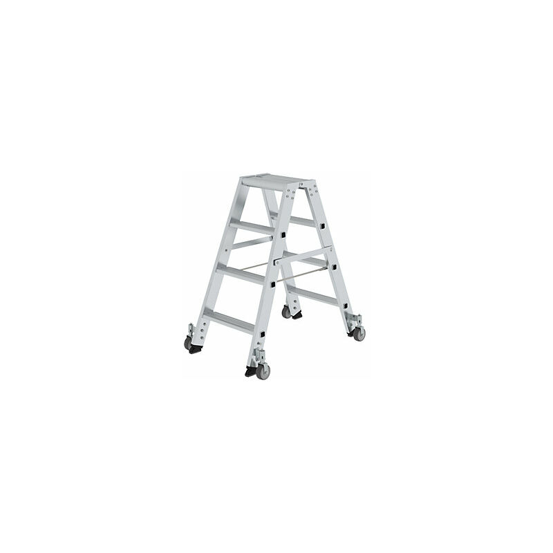 Scala a libro a gradini, salita su due lati, versione mobile, 2 x 4 gradini. Fornitura = montato. Tipo di prodotto = scale a libro a gradini, salita su due lati. Altezza di lavoro = 2500 mm. Salita = su due lati. Versione da salita = gradini. N. gradini, piattaforma inclusa = 2x4 pz. Materiale telaio = alluminio. Materiale gradini = alluminio con rivestimento antisdrucciolo. Profondità gradini = 80 mm. Peso = 9.7 kg. Dotazione ruote = 4 rotelle autofrenanti. Caratteristiche = con rotelle, pieghevole. Portata = 150 kg. Altezza verticale = 930 mm. Diametro ruote = 80 mm. Qualità professionale, ideali per l'uso quotidiano. Con piedini nivello® - adattamento flessibile alle superfici. Robusti e stabili - Montanti a sezione quadrata dalla forma conica. Montanti rinforzati con requisiti superiori a EN 131. Montanti e gradini in profilati estrusi di alluminio. Durevole flangiatura multipla dei gradini e dei pioli. Alta resistenza alla torsione. Distanza gradini 235 mm. Cinghie di fissaggio