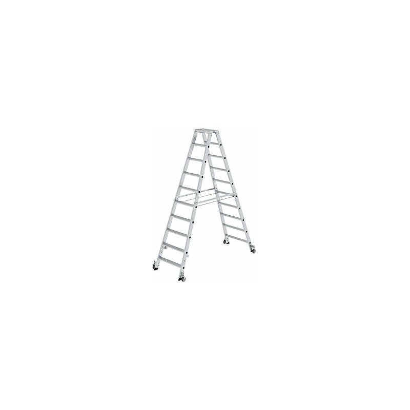 Scala a libro a gradini, salita su due lati, versione mobile, 2 x 10 gradini. Fornitura = montato. Tipo di prodotto = scale a libro a gradini, salita su due lati. Altezza di lavoro = 4000 mm. Salita = su due lati. Versione da salita = gradini. N. gradini, piattaforma inclusa = 2x10 pz. Materiale telaio = alluminio. Materiale gradini = alluminio con rivestimento antisdrucciolo. Profondità gradini = 80 mm. Peso = 18 kg. Dotazione ruote = 4 rotelle autofrenanti. Caratteristiche = con rotelle, pieghevole. Portata = 150 kg. Altezza verticale = 2340 mm. Diametro ruote = 80 mm. Qualità professionale, ideali per l'uso quotidiano. Con piedini nivello® - adattamento flessibile alle superfici. Robusti e stabili - Montanti a sezione quadrata dalla forma conica. Montanti rinforzati con requisiti superiori a EN 131. Montanti e gradini in profilati estrusi di alluminio. Durevole flangiatura multipla dei gradini e dei pioli. Alta resistenza alla torsione. Distanza gradini 235 mm. Cinghie di fissaggio