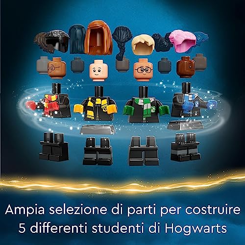Include un assortimento di parti di minifigure con cui i bambini possono costruire fino a 5 personaggi LEGO Harry Potter, oppure creare nuovi maghi e streghe di Hogwarts