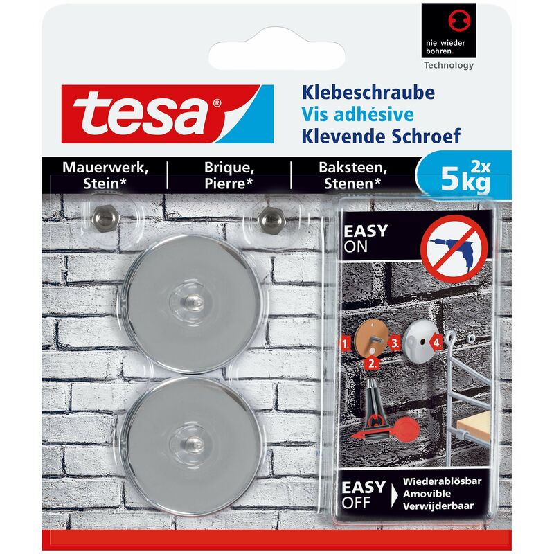 Senza fori: la vite adesiva rotonda per clinker e pietra consente con la sua piastra di copertura di design il fissaggio decorativo di oggetti ed è adatta per applicazioni in cui la vite rimane visibile. Si tratta di un'alternativa intelligente alle soluzioni di fissaggio tradizionali e consente di appendere oggetti senza trapano, tasselli e viti. Inoltre evita danni permanenti al pavimento. Forte tenuta: grazie alla qualità adesiva Tesa® superiore è possibile fissare in modo sicuro oggetti fino a un peso di 5 kg per vite in interni ed esterni. Superfici adatte per la vite rotonda adesiva: cemento, pietra, legno, piastrelle, plastica, vetro e metallo. Facile da applicare: dopo aver pulito accuratamente la superficie con un panno privo di polvere o una spazzola, è possibile fissare la vite adesiva con la colla. Si prega di lasciare la colla almeno Lasciare asciugare per 12 ore. Rimovibile: basta prendere una pinza per tubi e ruotare la vite adesiva lentamente e con una pressione