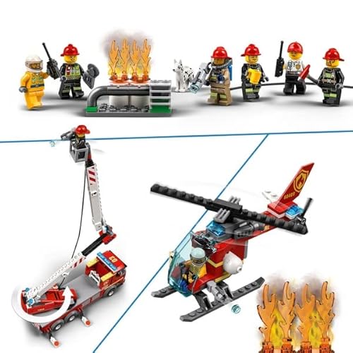 Contenuto: una grande auto dei pompieri, un veicolo 4x4, un elicottero giocattolo, un vigile del fuoco, un walkie-talkie, una torcia, 6 minifigure dei vigili del fuoco e una figura di cane da vigili del fuoco